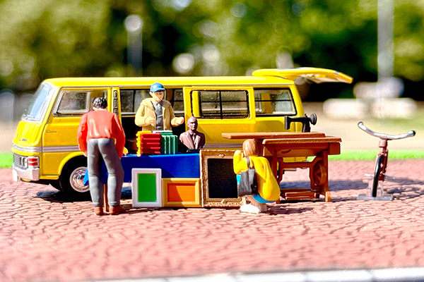 搬入車役の黄色い日産 ホーミーはスライドドアとリアゲートが開閉でき、より表情豊かな情景が楽しめます。