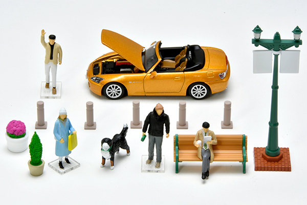 「都会の街角」をテーマにしたセット。クルマのオーナーとショッピングを楽しむ人、バーニーズマウンテンドッグと散歩する人、街の情景パーツ各種で街角のシーンを展開できます。