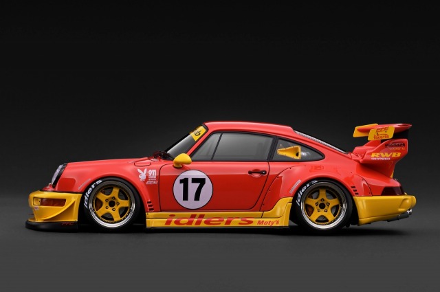 「RWB 964」を1/18スケールレジンモデルで再現。ボディカラー:レッド/イエロー。WORK S1タイプ18インチホイール(ポリッシュ&イエロー)にローダウン仕様。