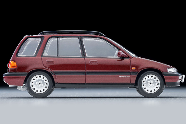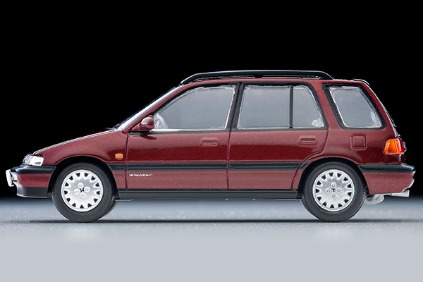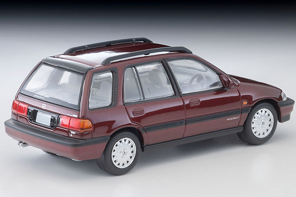 TLV-NEOではEF系のシャトルをシャトル、ビーグル、プロと展開しておりますが、今回新仕様の登場です。シャトル56iのホイールはもちろん、後期型から設定された暗い色調のレッド・パールのボディ色を再現しました。同時発売予定の「LV-N297c ホンダ シビックシャトル RT X(青)90年式 フィギュア、マウンテンバイク付」と組み合わせてもお楽しみいただけます。